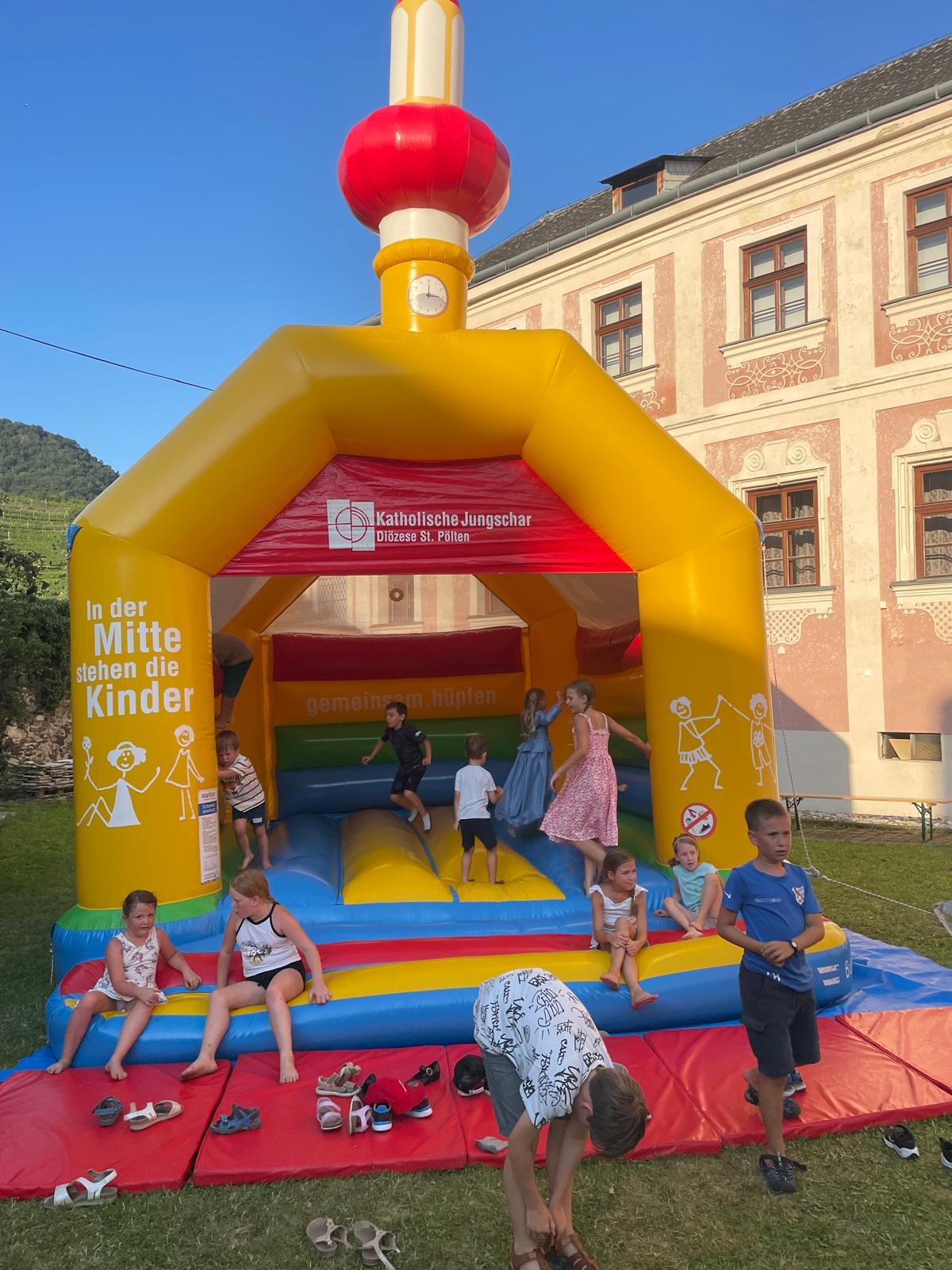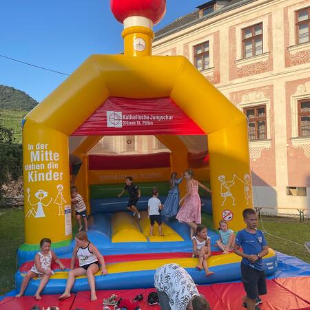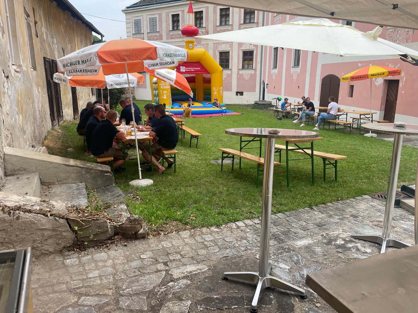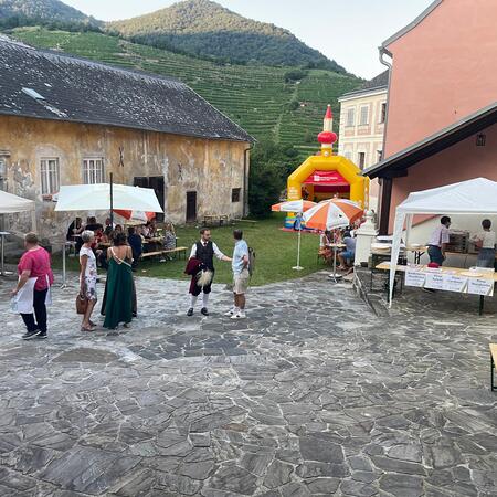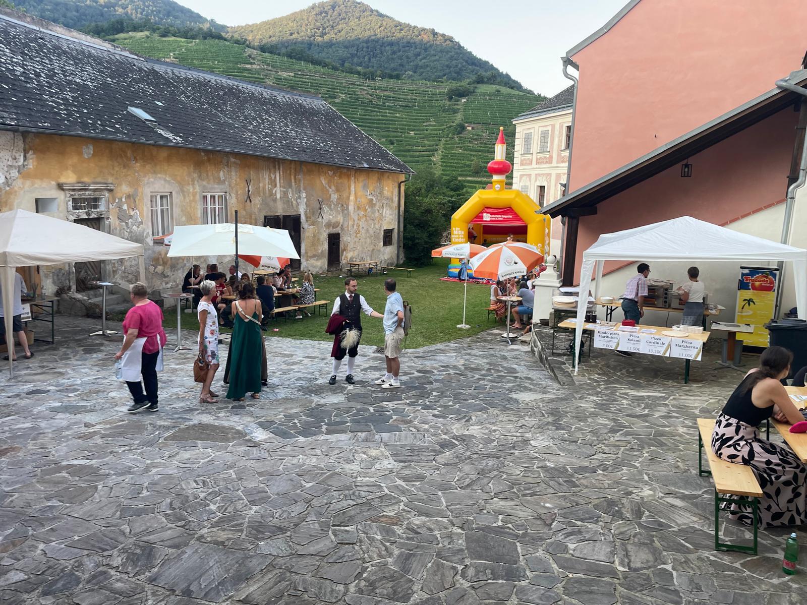 Etwas abseits vom Geschehen im schönen Ambiente des Hofes des Pfarrhofes wurden hervorragende Pizzen frisch aufgebacken und Wachauer Weine zum Verkauf angeboten. Die Kinder, für die eine „Hüpfkirche“ aufgebaut war, konnten sich nach den anstrengenden sportlichen Hüpf-Einsätzen an Säften wieder erfrischen.