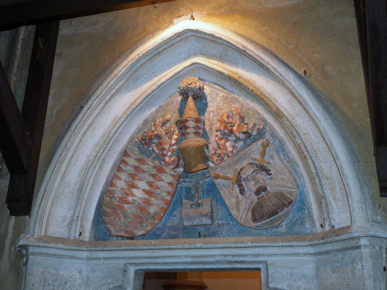 Die beiden Schilder über dem Eingang sind die Wappen des Stifterpaares (rechts: Wappen der Ritter von Schwallenbach; links: Wappen der Ritzendorfer).