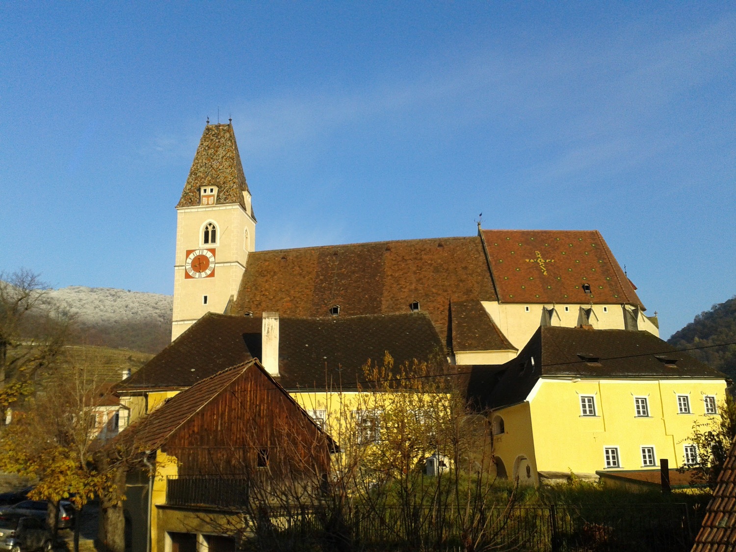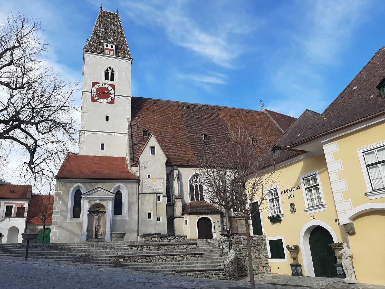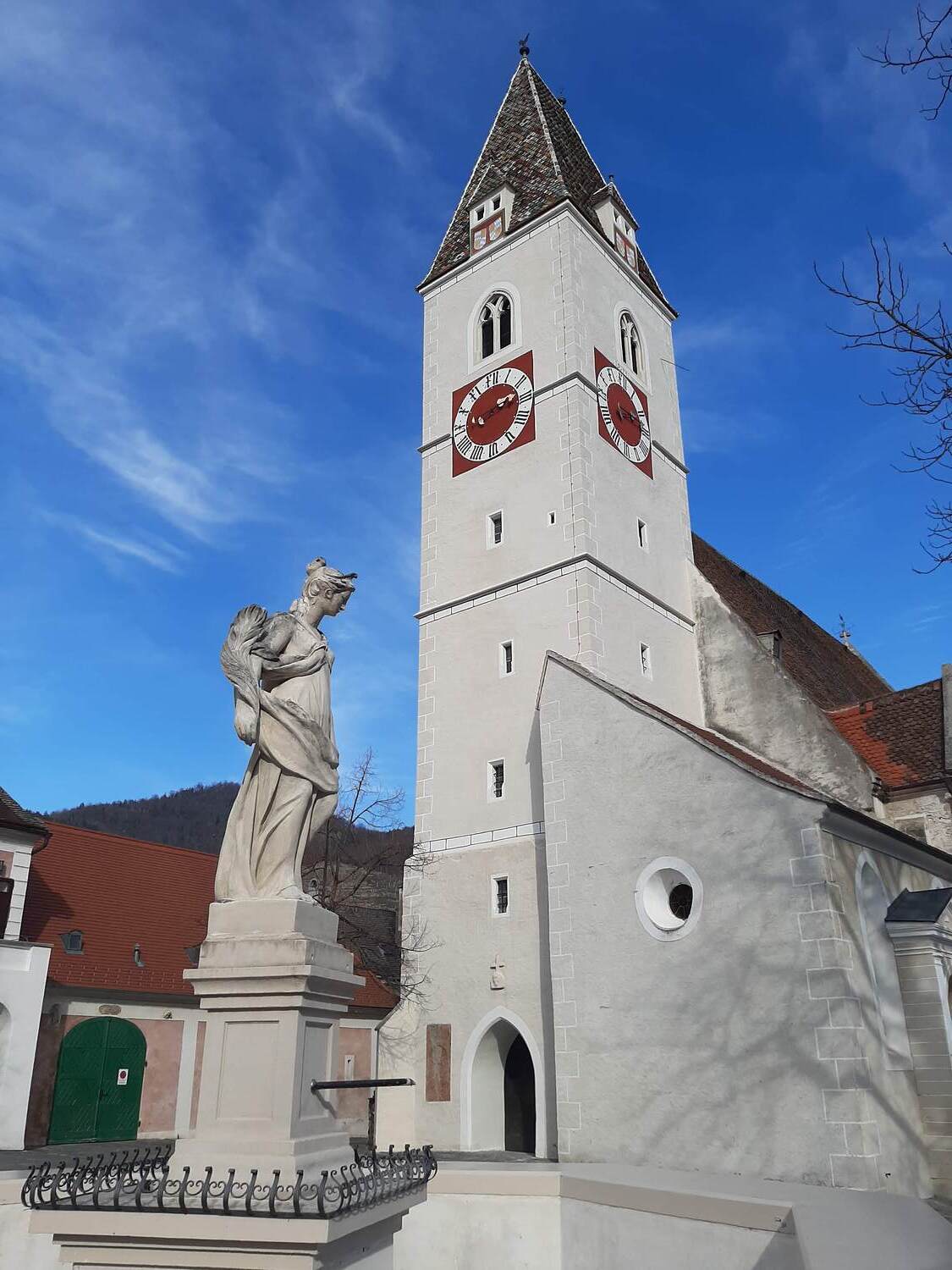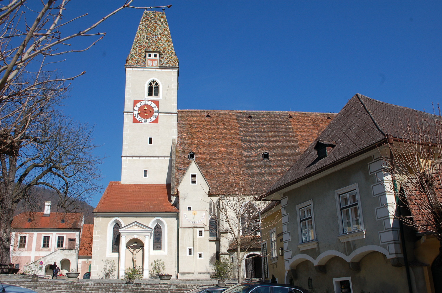Die heutige Kirche ist ein bedeutendes Werk der Spätgotik und erhebt sich mit ihrem mächtigen Westturm am heutigen Kirchenplatz. Ursprünglich war um die Kirche der Friedhof (Kirchhof). In der Reformationszeit wurde von den Reformierten ein zweiter Friedhof ausserhalb des Ortes angelegt. Nach der Reformationszeit wurde dann nur mehr der neue Friedhof benützt. Der alte Kirchhof wurde aufgelassen und der heutige Kirchenplatz mit dem Brunnen angelegt.